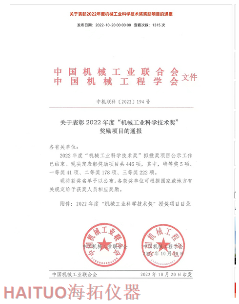 海拓儀器榮獲2022年度中國機(jī)械工業(yè)科學(xué)技術(shù)獎(jiǎng)?ICC訊?10月20日,2022年度“中國機(jī)械工業(yè)科學(xué)技術(shù)獎(jiǎng)”項(xiàng)目名錄正式發(fā)布,由海拓儀器(江蘇)有限公司完成的“超快速冷熱沖擊試驗(yàn)系統(tǒng)關(guān)鍵技術(shù)研究與系列應(yīng)用”項(xiàng)目榮獲2022年度“中國機(jī)械工業(yè)科學(xué)技術(shù)獎(jiǎng)”三等獎(jiǎng)。??據(jù)了解,中國機(jī)械工業(yè)科學(xué)技術(shù)獎(jiǎng)是根據(jù)《國家科學(xué)技術(shù)獎(jiǎng)勵(lì)條例》和《社會力量設(shè)立科學(xué)技術(shù)獎(jiǎng)管理辦法》的有關(guān)規(guī)定,由中國機(jī)械工業(yè)聯(lián)合會和中國機(jī)械工程學(xué)會共同設(shè)立并經(jīng)國家科學(xué)技術(shù)部批準(zhǔn),在國家科技獎(jiǎng)勵(lì)主管部門登記的面向全國機(jī)械行業(yè)的綜合性科技獎(jiǎng)項(xiàng)。旨在表彰在機(jī)械工業(yè)科技工作中作出突出貢獻(xiàn)的單位和人員,獎(jiǎng)勵(lì)范圍包括:機(jī)械工業(yè)科學(xué)技術(shù)發(fā)明成果、機(jī)械工業(yè)科學(xué)技術(shù)進(jìn)步成果、機(jī)械工業(yè)工程化和新技術(shù)推廣成果和機(jī)械工業(yè)軟科學(xué)和標(biāo)準(zhǔn)成果。??海拓儀器是一家集研發(fā)、制造、貿(mào)易于一體高科技現(xiàn)代化公司,公司成立于2005年,主要產(chǎn)品包括:超快速冷熱沖擊試驗(yàn)機(jī)(熱流儀)、快速溫變應(yīng)力篩選試驗(yàn)箱(ESS), -